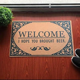 Este modelo de felpudo es una variación de su hermano excepto que el texto está en inglés: ¡Bienvenido ! ¡Espero que hayas traído cerveza !